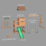 Montpelier to plac zabaw jak mała rezydencja w Twoim ogrodzie. Na górze czeka przestronny domek z dwuspadowym dachem, pełnymi drzwiami i dużymi oknami wykuszowymi, w których dzieci mogą bawić się w dom albo w pałac. Przedni balkon służy jako dodatkowy taras i miejsce startu dla superszybkiej zjeżdżalni o długości 2,5 m. Małpi gaj i drabinka prowadzą prosto na górny poziom, zachęcając do wspinania i ruchu.