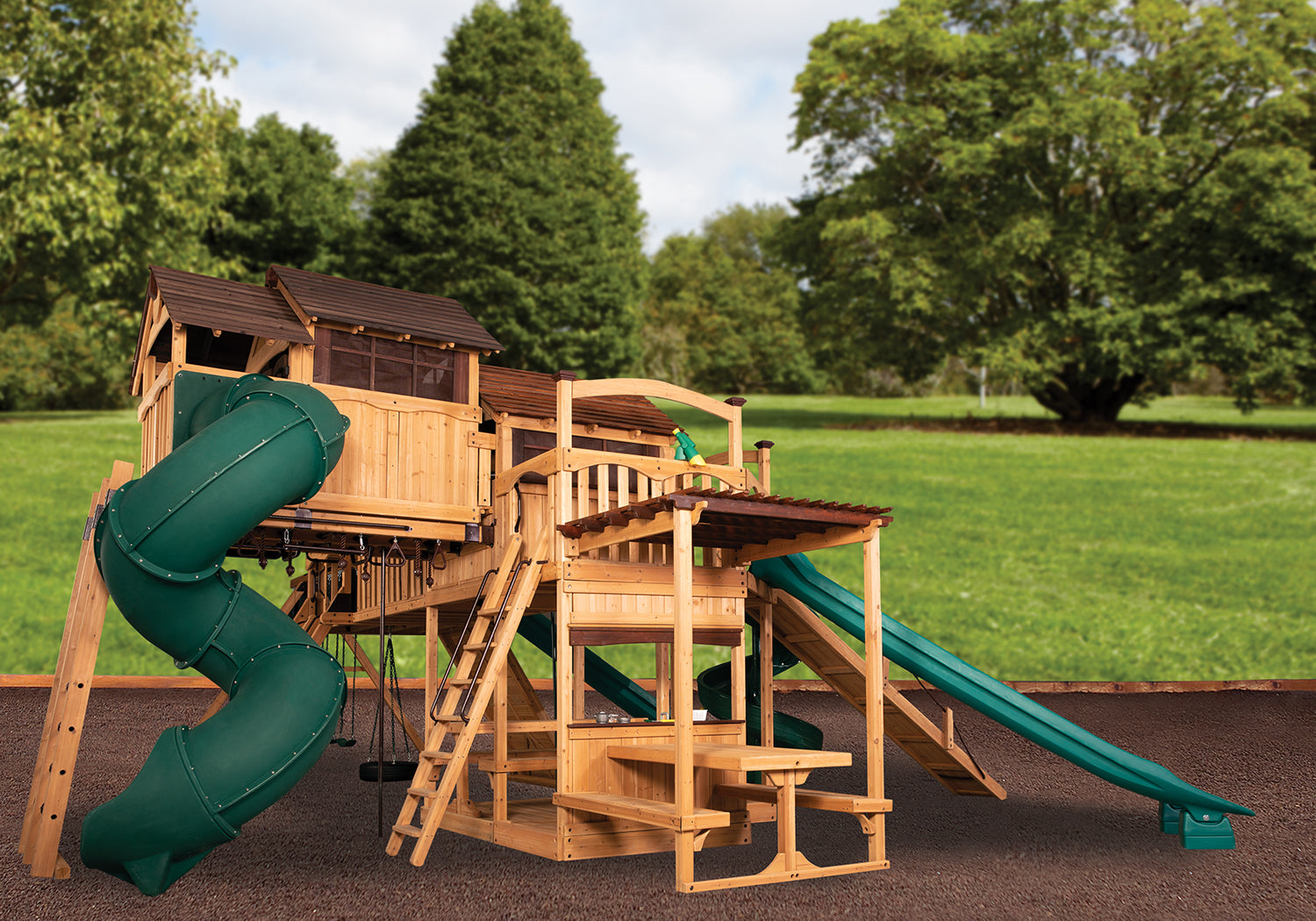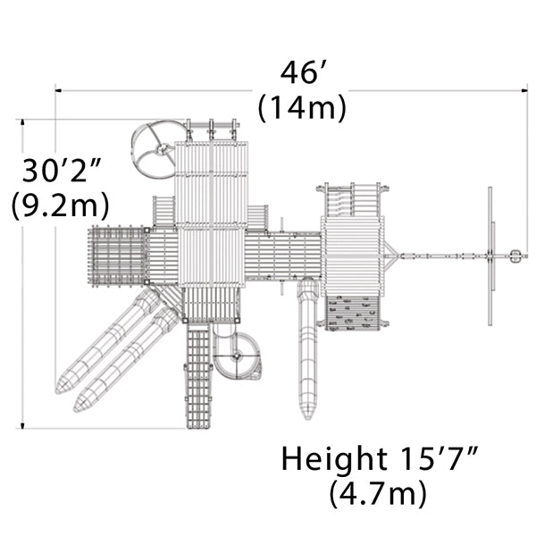 Zestaw łączy w sobie dwa różne style fortów – Treehouse i Peak – połączone mostem przygodowym i otulone drewnianym gankiem, który nadaje całości wyjątkowy, „architektoniczny” charakter. Kilka zjeżdżalni, małpi gaj, spiralna tuba oraz przytulny kącik kuchenny sprawiają, że każdy fragment tego placu zabaw czymś zaskakuje i zachęca do kolejnej zabawy.